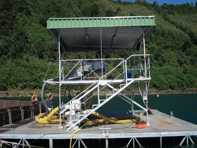 Aquaservice S.A, ha instalado en toda la región Torres de carga para peces, Implementando torres en plataforma flotantes de traslado de peces, muelles de carga a camiones y embarcaciones para alevines y smolt.