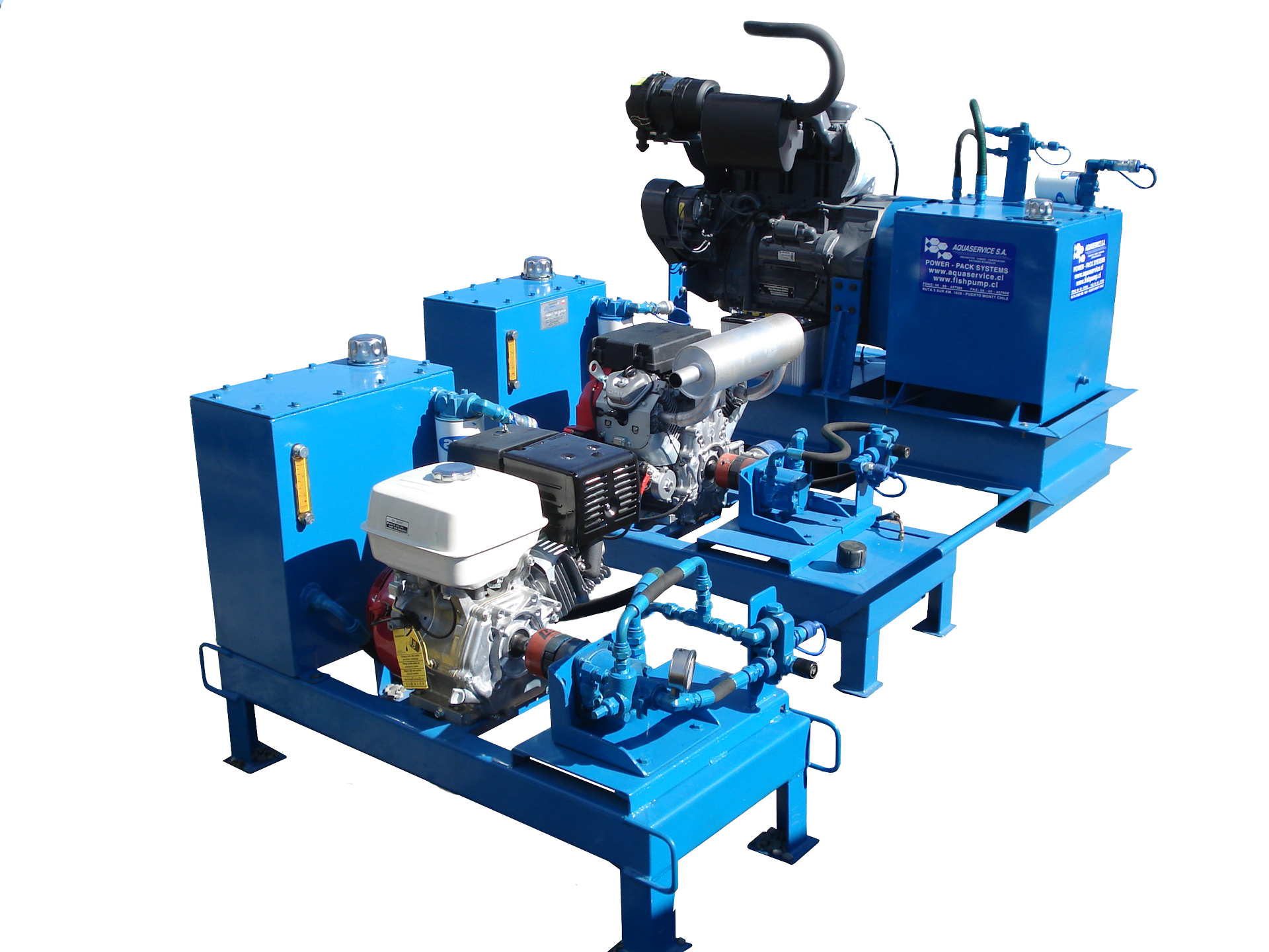 Aquaservice S.A, fabrica para accionar sus bombas , seleccionadoras y winches, una gran gama de Pack Hidraulicos, el diseño se calcula de acuerdo a la aplicación y necesidad del cliente, dentro de la gama fabricamos unidades con motores Diesel, Bencineros y eléctricos, con potencias que van desde los 5 H.P hasta los 200 H.P.